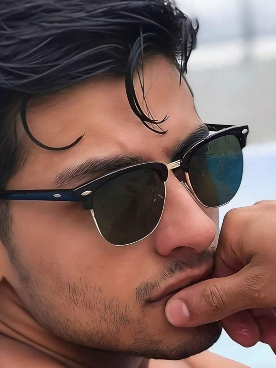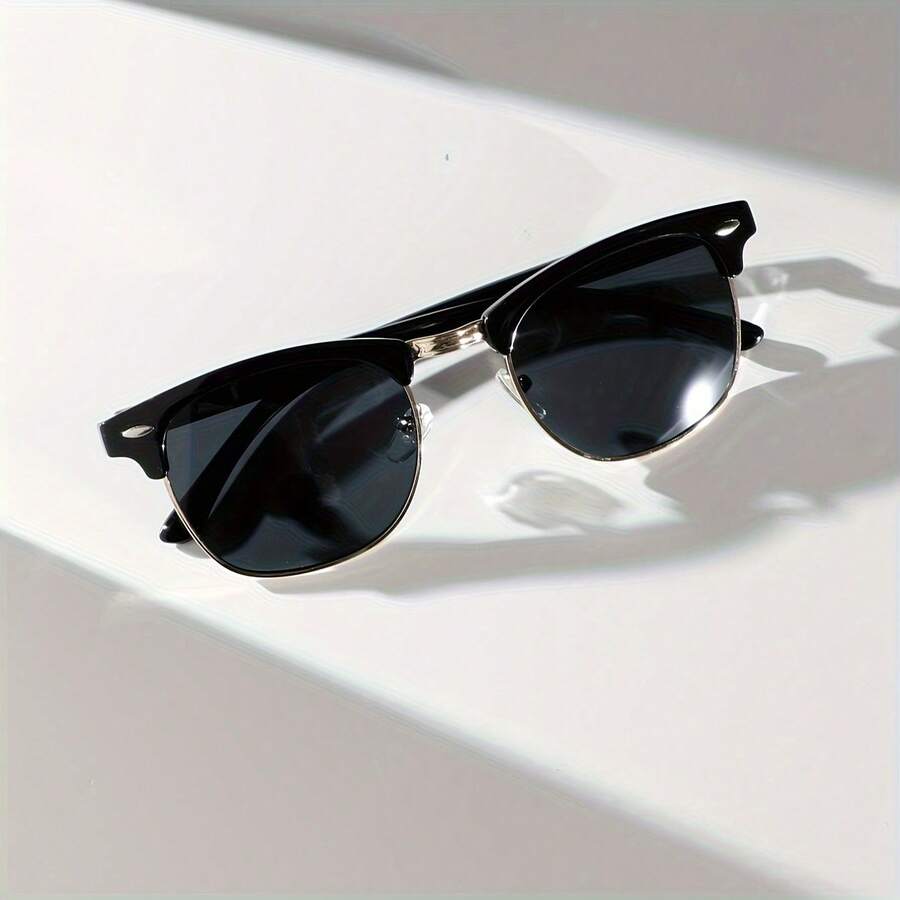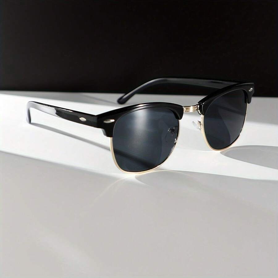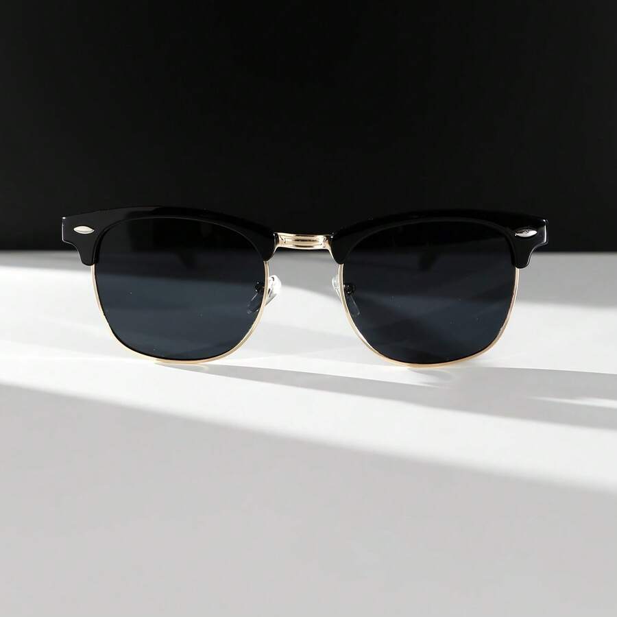 De clubmaster is misschien wel de meest tijdloze zonnebrilstijl die er bestaat. Half montuur in zwart plastic aan de bovenkant, goudkleurig metaal aan de onderkant. Het is een ontwerp dat al decennia meegaat en nooit uit de mode raakt.